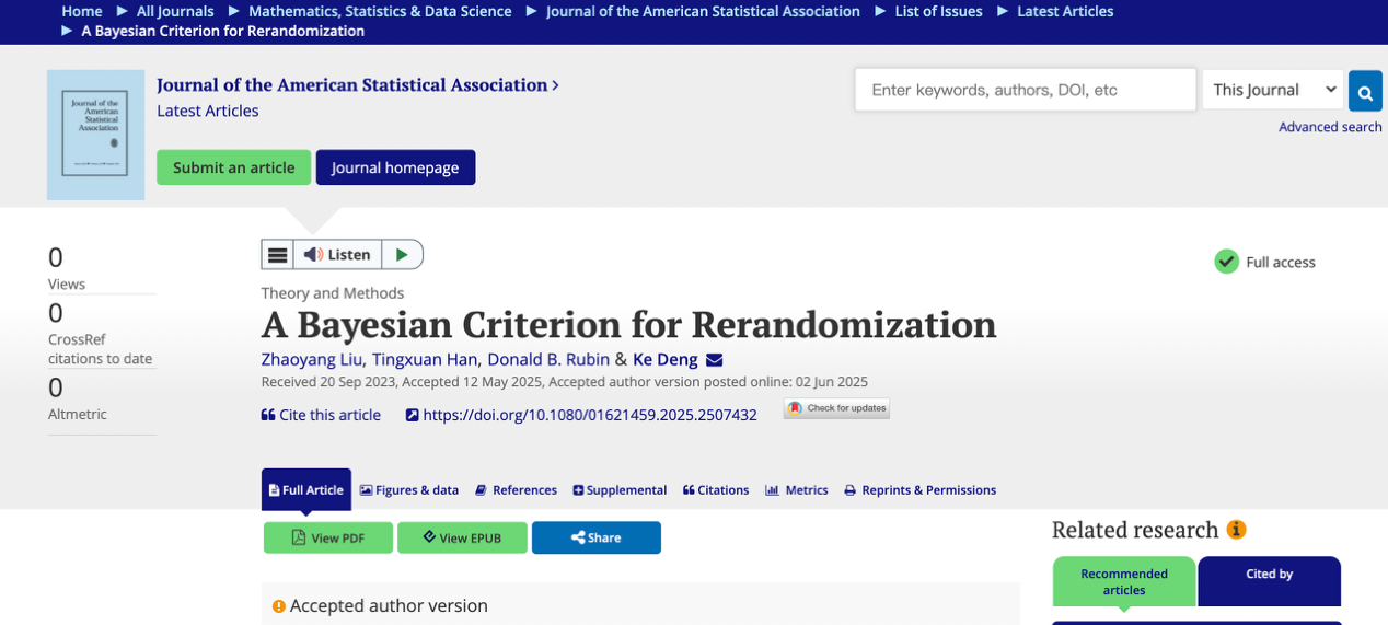 邓柯副教授课题组在统计学国际顶尖期刊Journal of the American Statistical Association (JASA) 在线发表题为“A Bayesian Criterion for Rerandomization” 的研究论文,提出一种基于贝叶斯的重随机化方法,可以有效提升处理效应估计的准确性。邓柯课题组2017级博士生刘朝阳博士和2021级博士生韩庭萱是论文的共同第一作者,邓柯副教授为通讯作者,与美国科学院院士Donald B. Rubin教授共同指导了该研究。