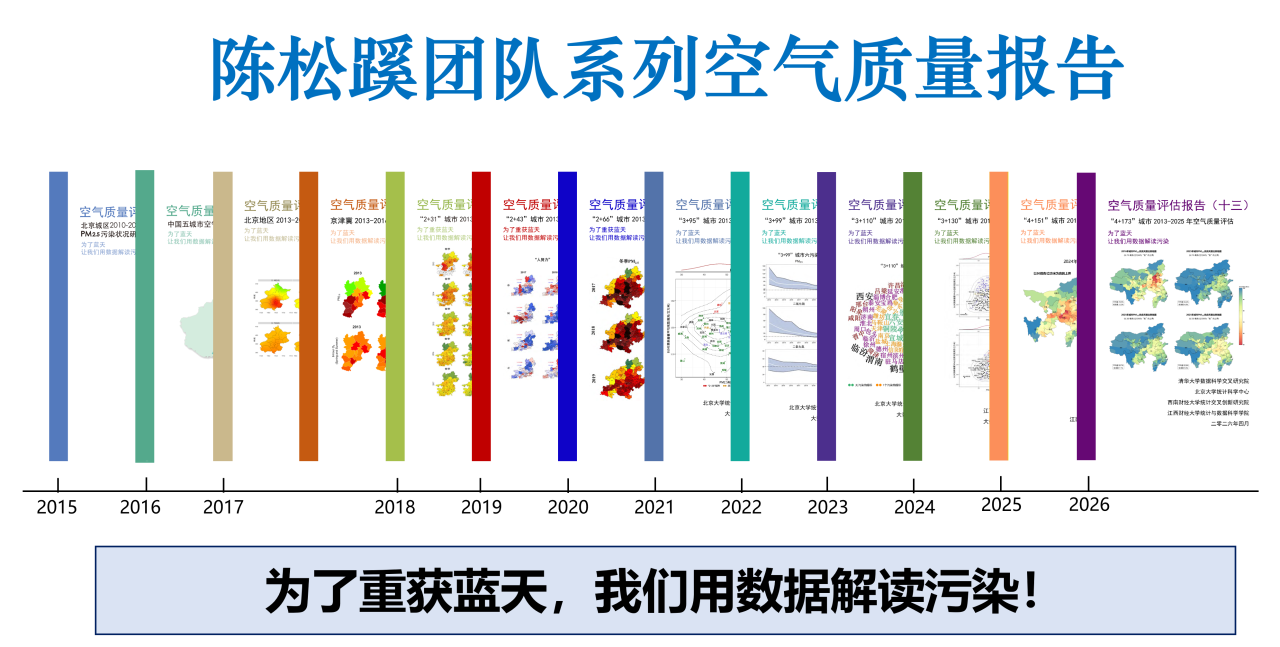 2012年,PM2.5首次纳入《环境空气质量标准》,我国的空气质量监测体系迎来一次关键升级,陈松蹊教授带领研究团队开始关注并追踪中国城市的空气质量变化。次年,74个重点城市开始实时公布PM2.5监测数据,其中仅有3个达到当时的国家二级标准,整体年均浓度达到72微克/立方米,是当时二级标准(35微克/立方米)的两倍多。2015年3月,团队首份空气质量评估报告出炉,每年一期,从无间断。